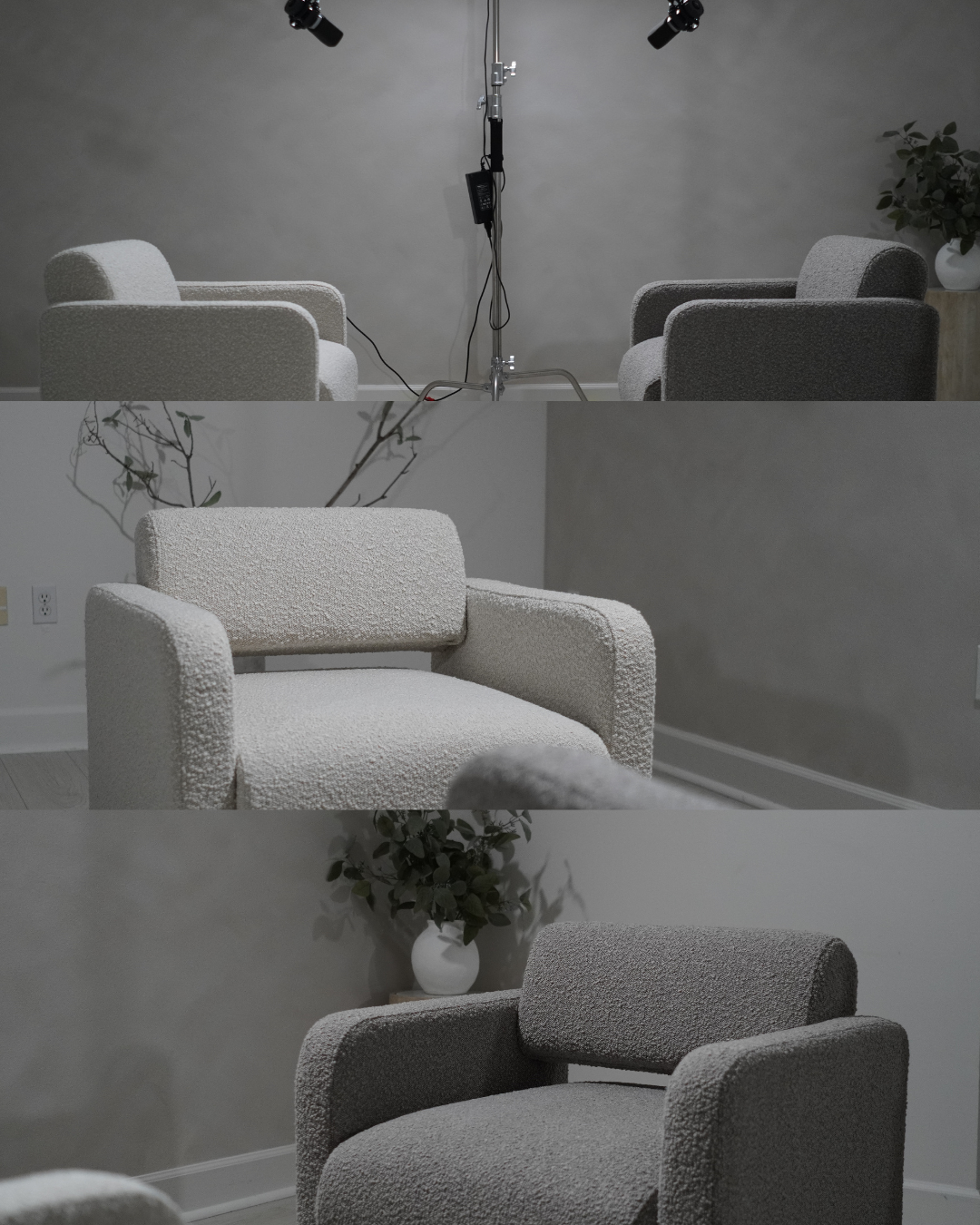 - Neutral tones (paper backdrops ; lime wash wall ; furniture items/props)
